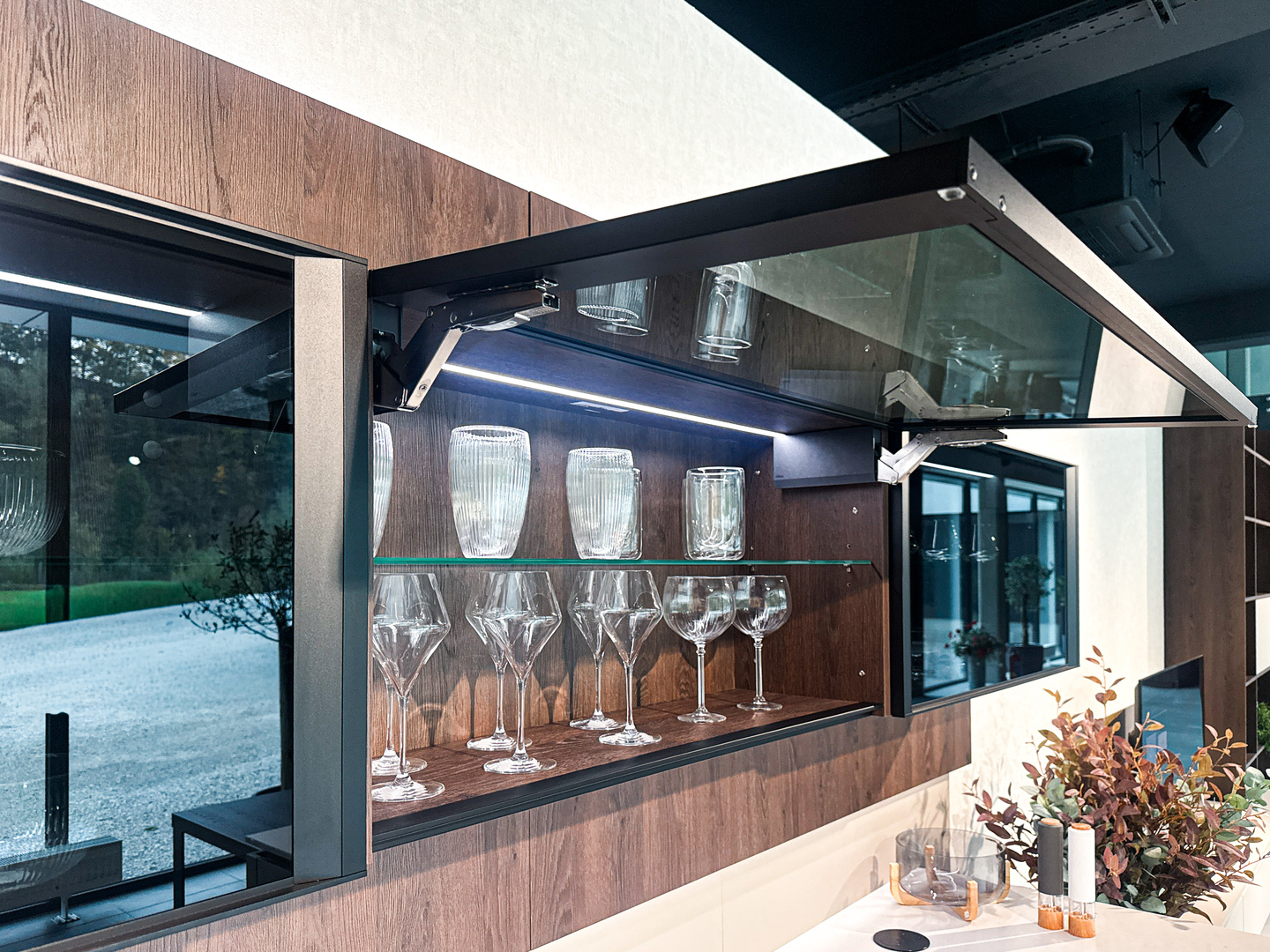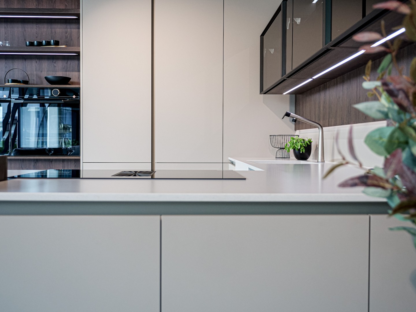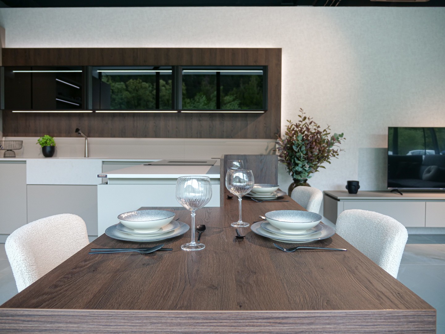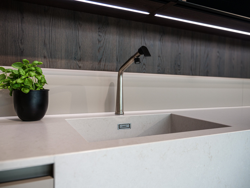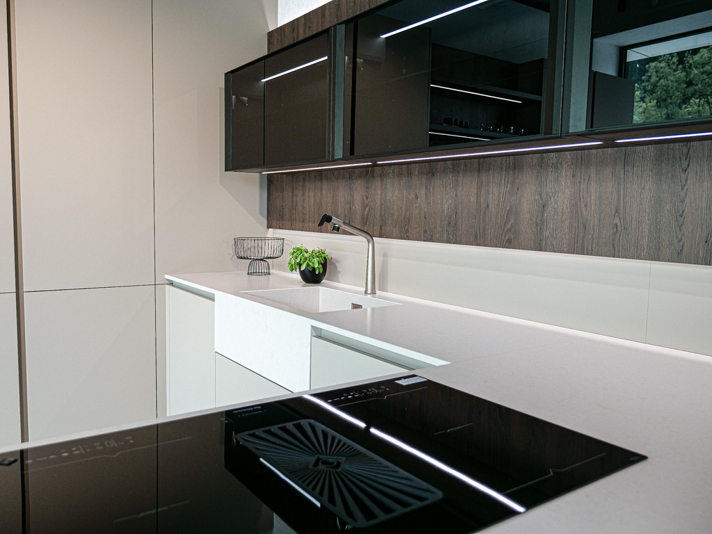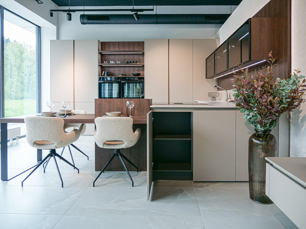 Vítejte v podmanivé kuchyni, která ve vás už v prvním okamžiku zanechá neopakovatelný dojem. Dokonalý soulad materiálu Kamenná Šedá s výraznějším dřevodekorem Dub Gladstone Tabak přináší do kuchyně křehkou rovnováhu mezi moderním designem a hřejivou útulností domova. Sofistikovaný matný povrch v harmonii s výraznou kresbou tmavšího dubu navozuje atmosféru nadčasové elegance, ve které se cítí přirozeně majitel vysněné kuchyně i každá návštěva. Její pozornost zaručeně přitáhne praktický kuchyňský ostrůvek, přímo propojený s jídelním stolem. Díky této fúzi probíhá příprava jídel v kuchyni plynule do klidných okamžiků při snídani či vzácných večerních rozhovorů. Pracovní deska Salestone Motion Gray se svojí jemnou šedou kresbou dodává prostoru zjemněný luxusní nádech a také kontrast s elegantními prosklenými skříňkami v horní části kuchyňské linky. Všimli jste si nápaditého řešení s otevřenými policemi nad a pod spotřebiči? Integrované LED osvětlení přeměňuje tento prostor na mini designovou galerii pro oblíbené kuchyňské doplňky a dekorace. Pokud byste rádi tuto kuchyni spatřili na vlastní oči, navštivte náš showroom v domovském kuchyňském studiu Dalno Dolný Kubín a navnímejte ji do posledního detailu.